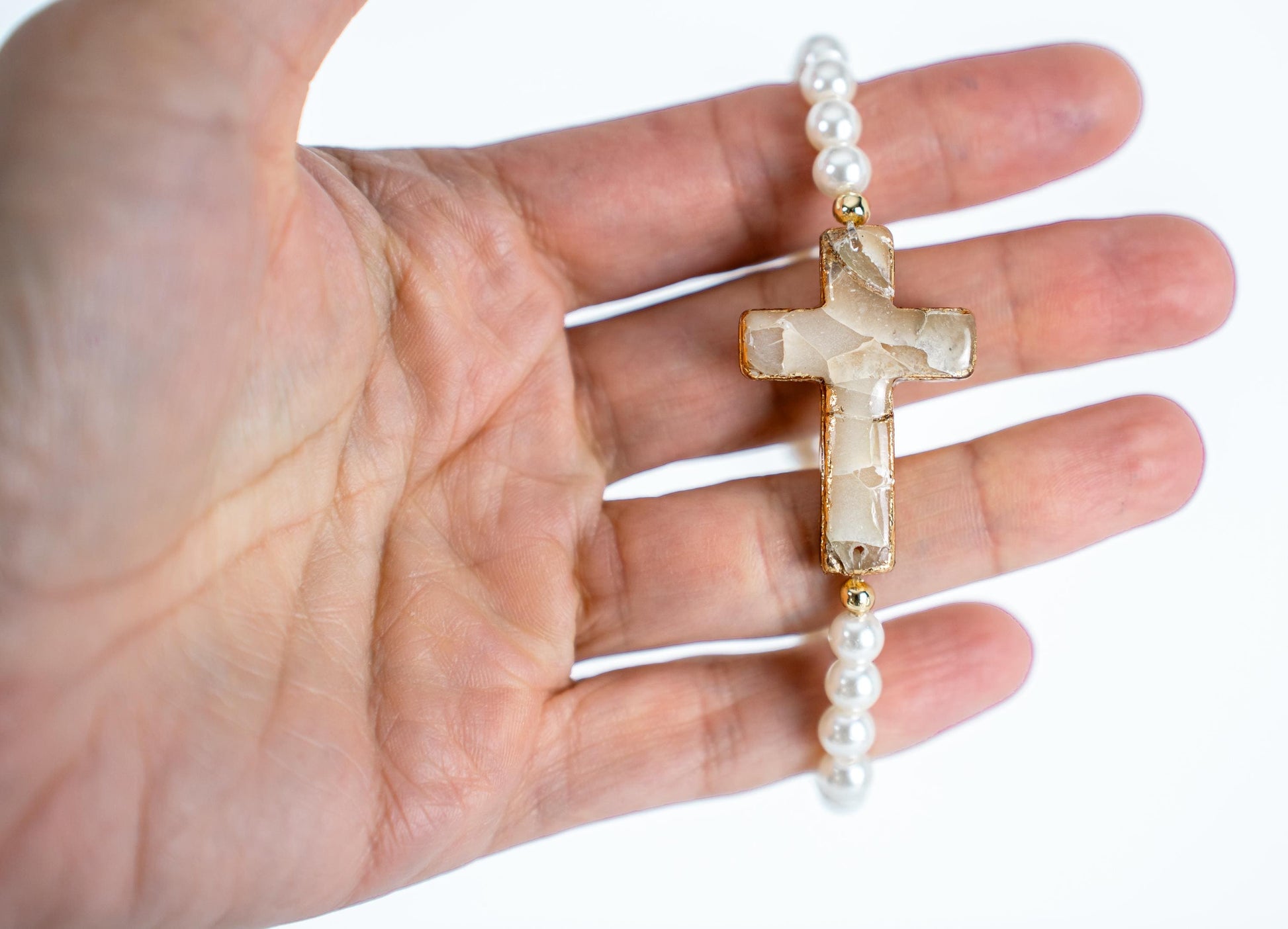 Handmade Cross Bracelet – Polymer Clay Stone-Inspired Charm with Gold Leaf & Glass Faux Pearls – Faith Jewelry Gift