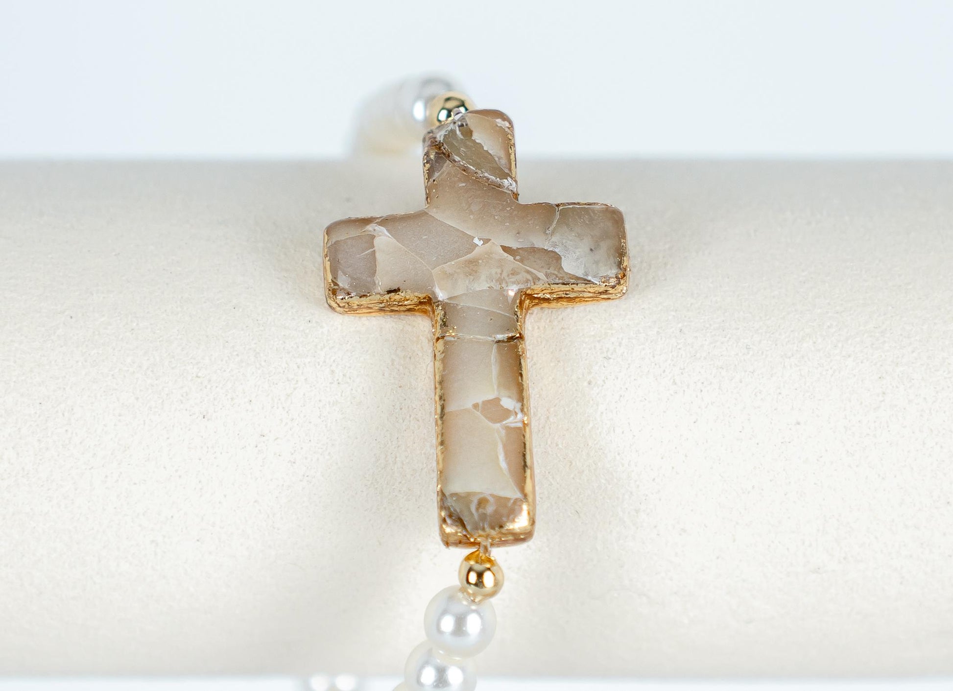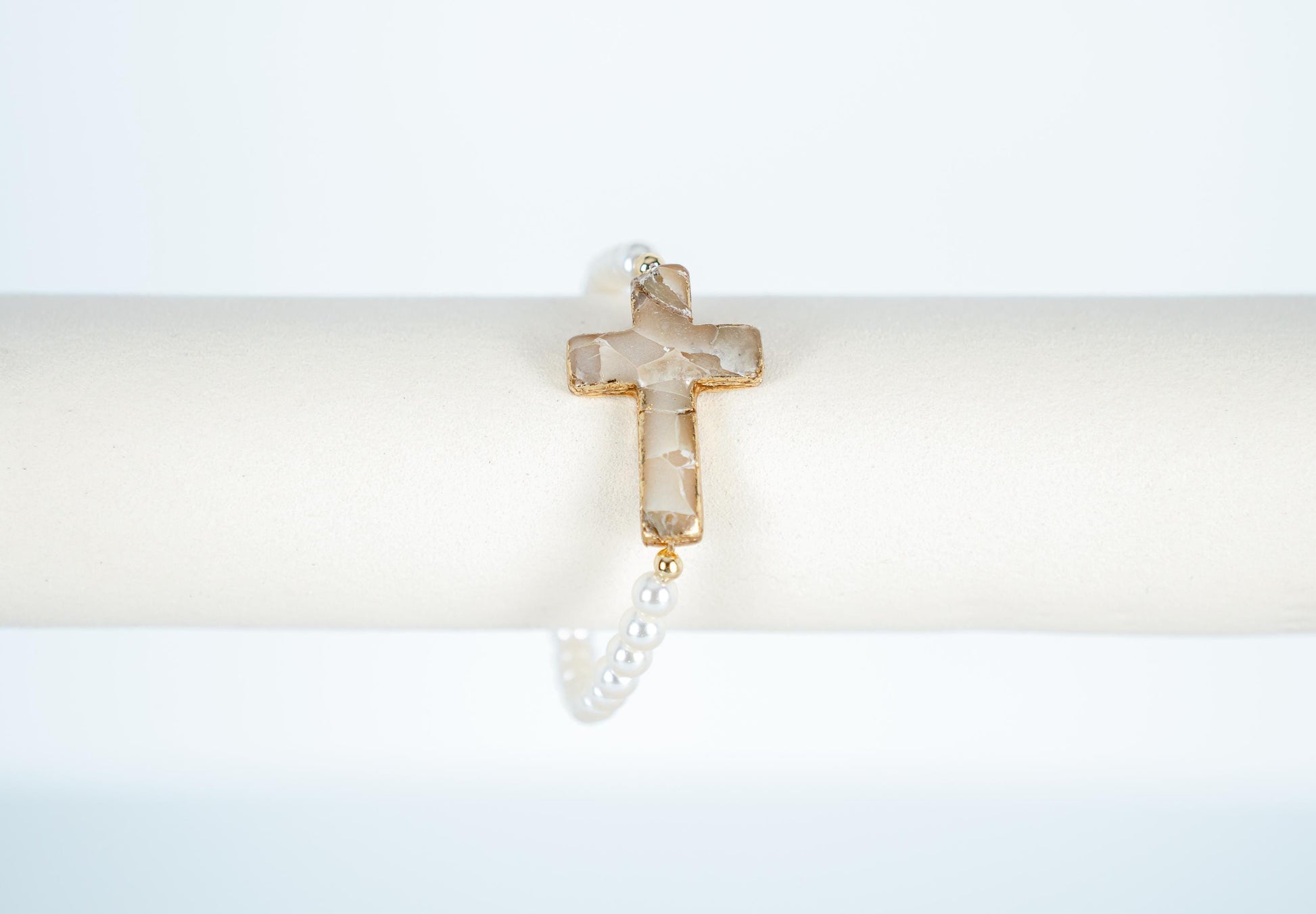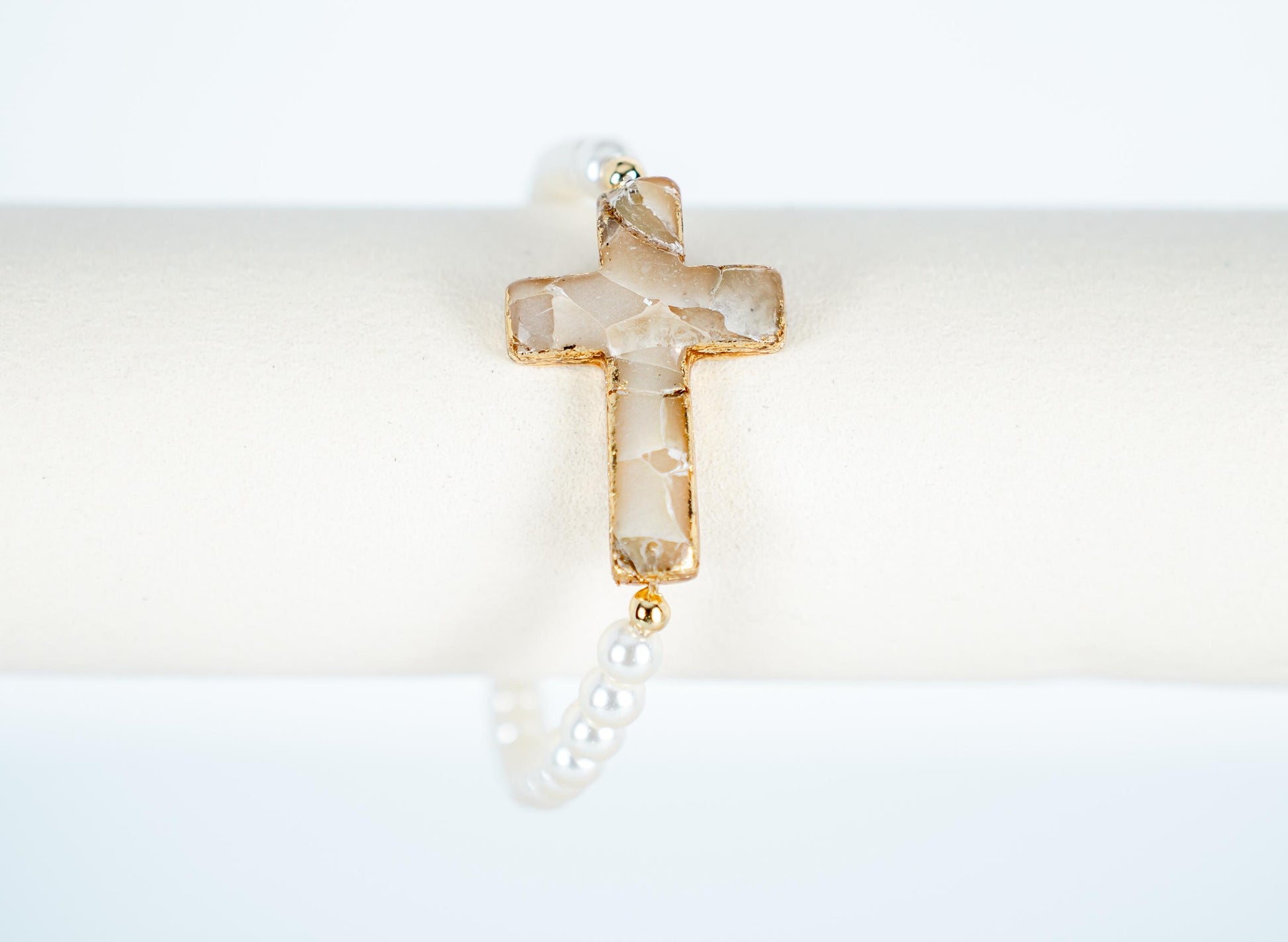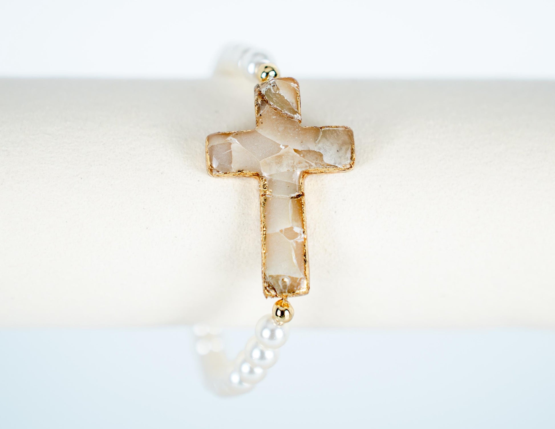 Carry a symbol of your faith with a touch of elegance with this handmade cross bracelet. The cross charm is a polymer clay faux stone effect, organically sculpted to resemble natural stone. Each cross is hand-finished in soft neutral tones—creams, tans, and whites—with shimmering gold leaf edges for a timeless, radiant touch.